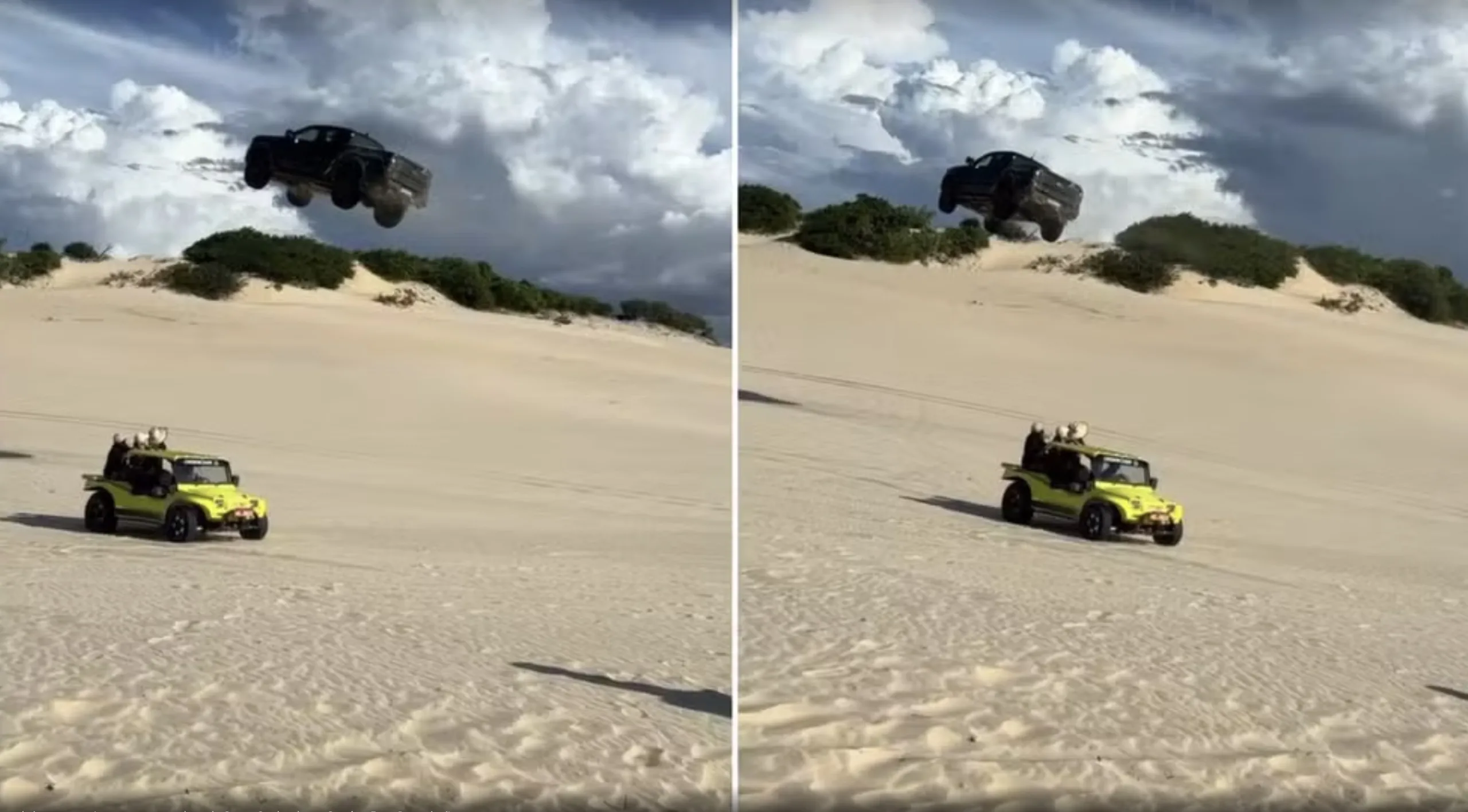 Turistas gravaram o momento em que uma caminhonete avança por uma duna e literalmente salta por cima de um buggy parado com ocupantes em Canoa Quebrada, no Ceará.